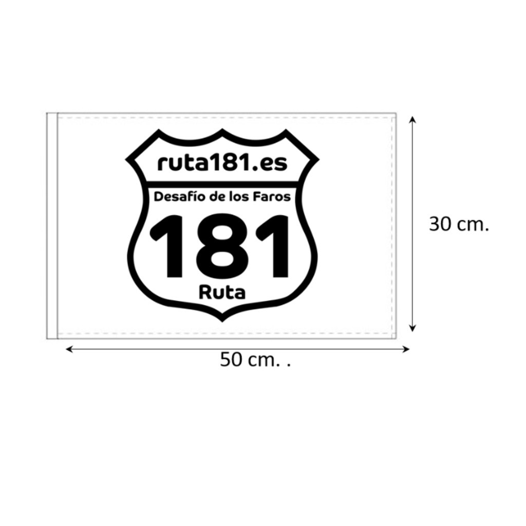 - Bandera de la Ruta 181 de 1m. x 1m. - 2 anillas el lateral izquierdo, cinta de refuerzo y costura perimetral con doble pespunte.