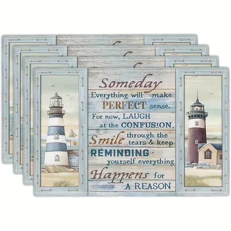 Dale frescura y personalidad a tu mesa con este set de 4 salvamanteles rectangulares de estilo náutico, decorados con un delicado diseño de faro azul.